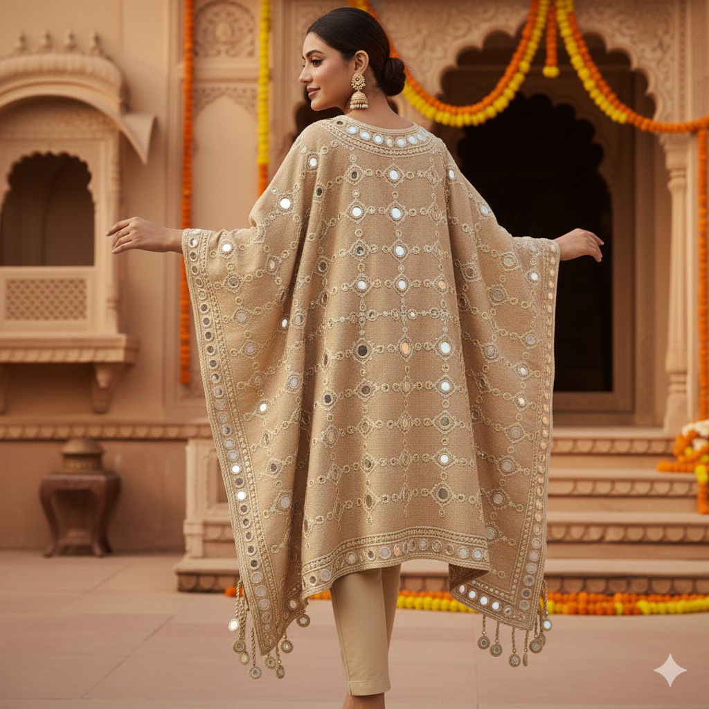 Stunning beige poncho enhanced with traditional mirror work; perfect for festive occasions.