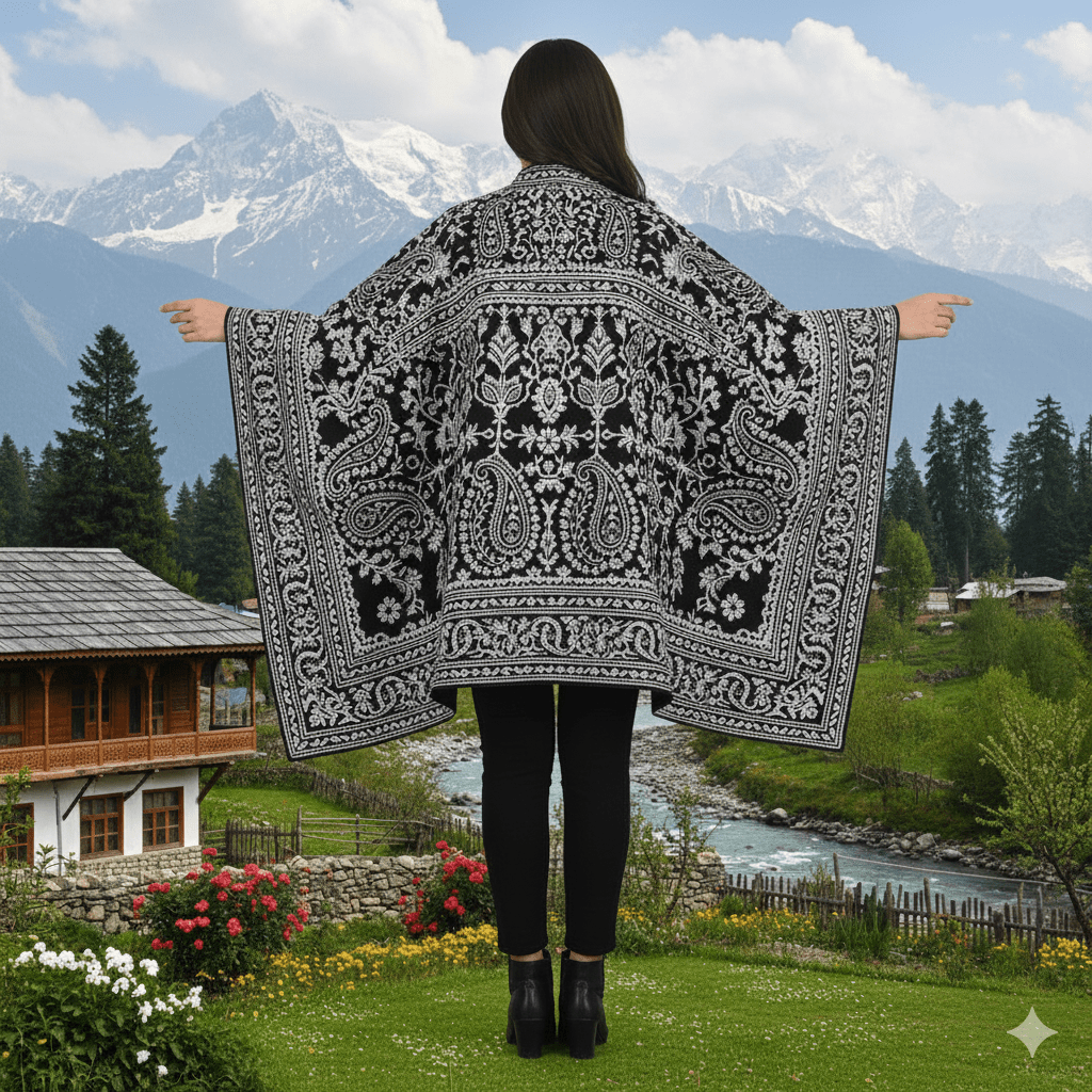 Bold black and white wool poncho with traditional Kashmiri_ patterns