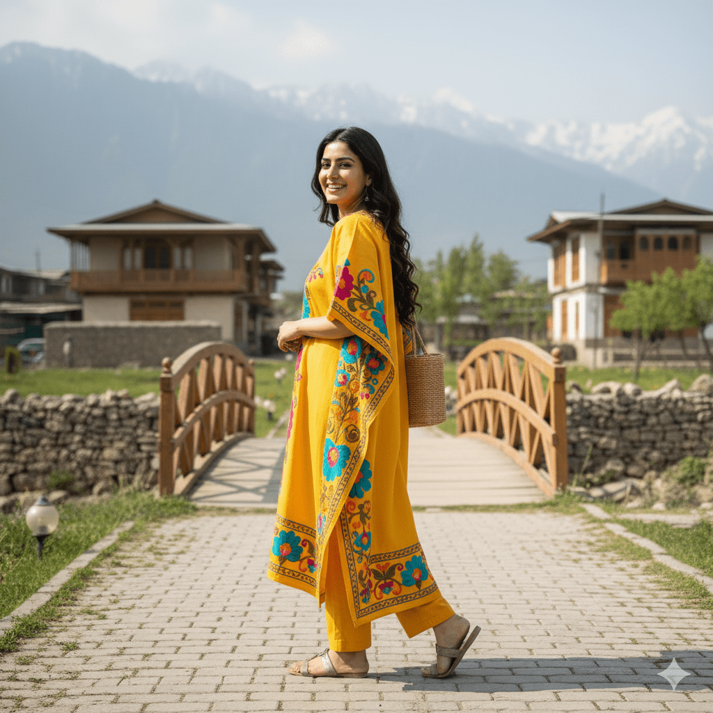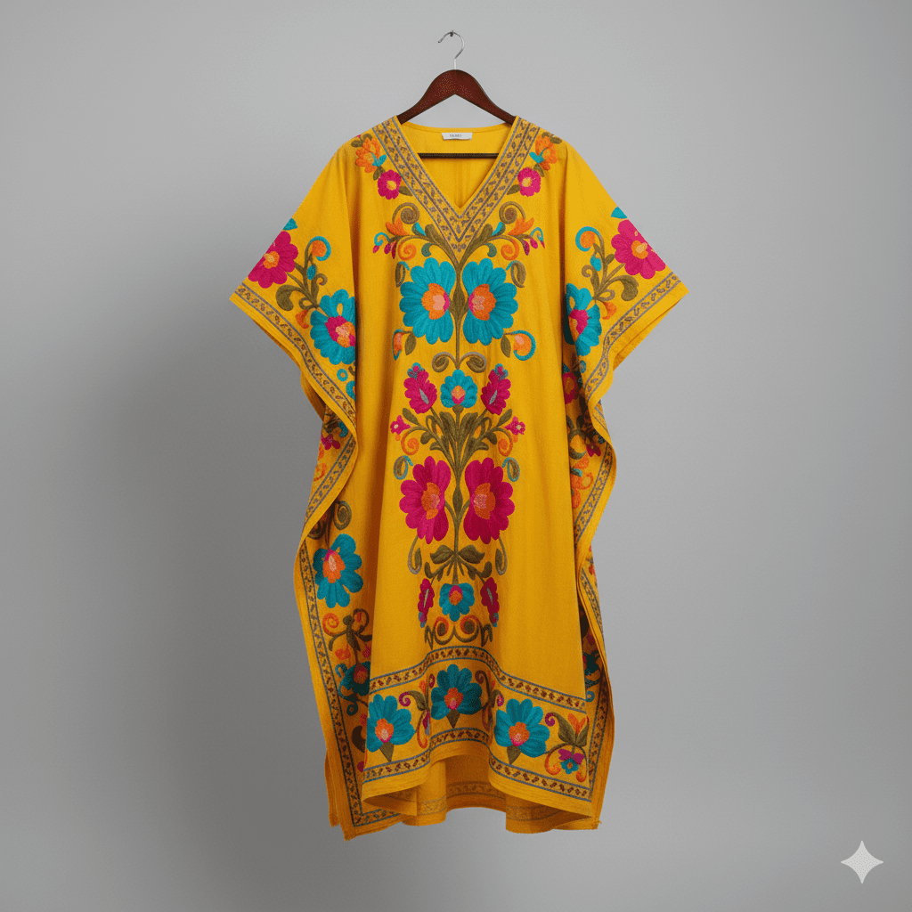 Boho style meets Kashmiri_ embroidery in this yellow floral kaftan for casual outings.