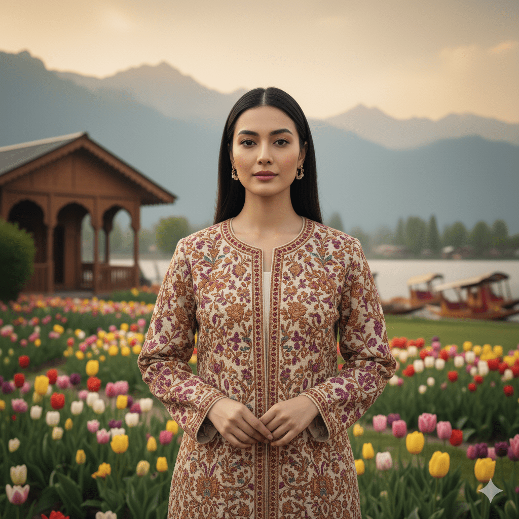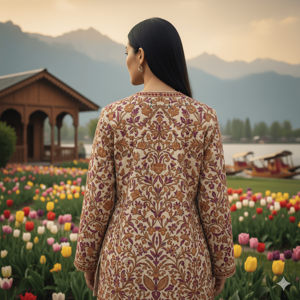 Soft cream wool with fine aari motifs; classic and festive wear.