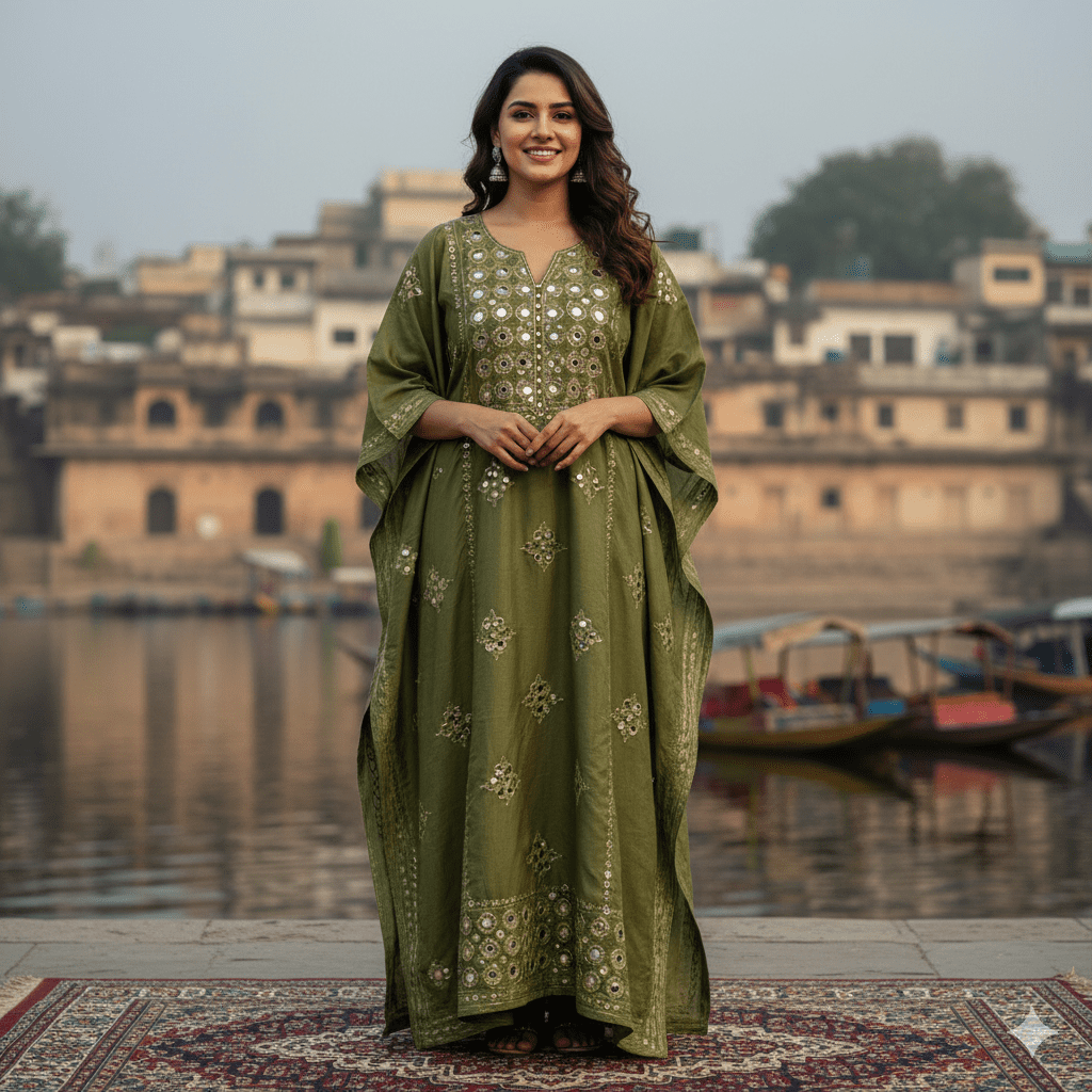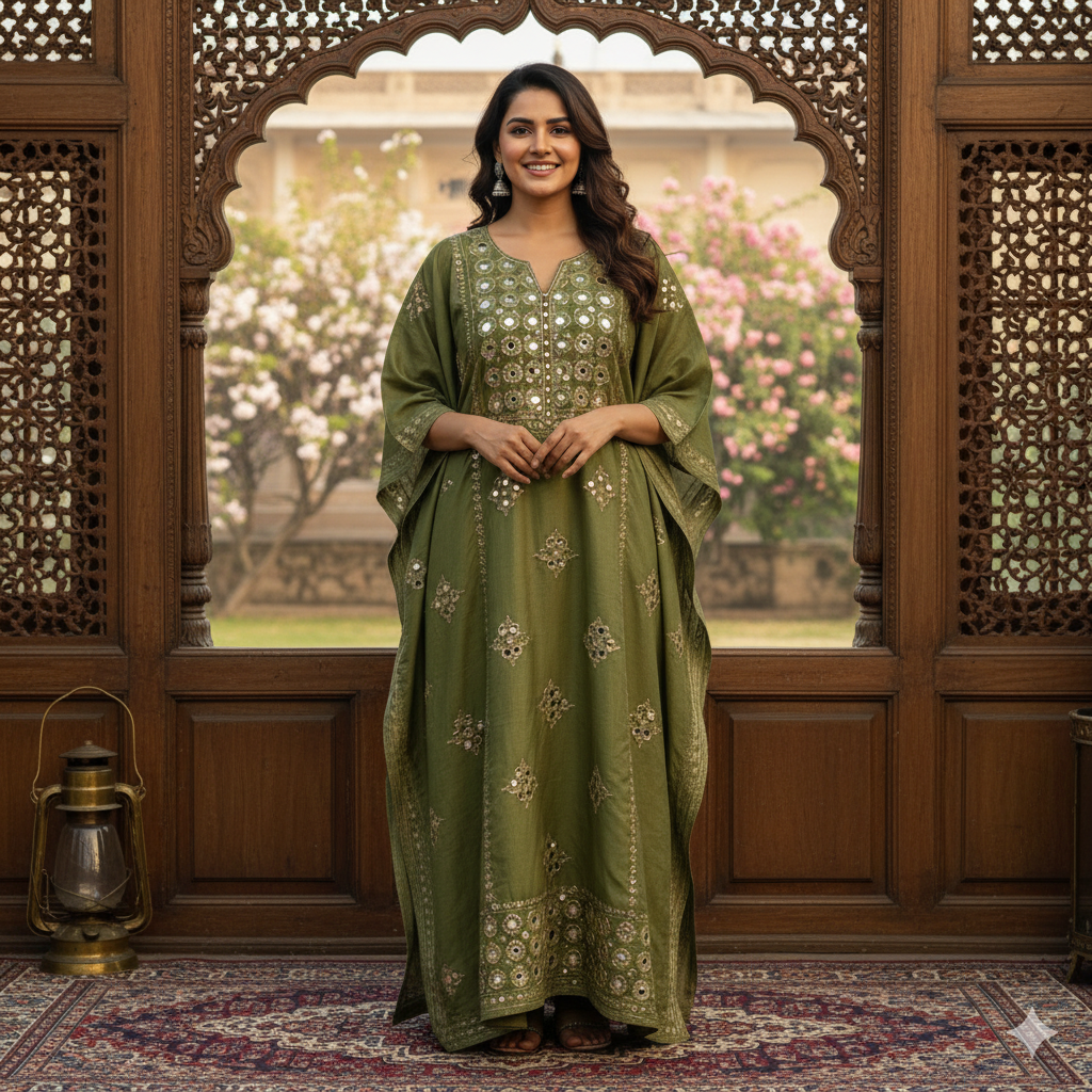 Traditional mirror work on olive green kaftan for chic ethnic style.