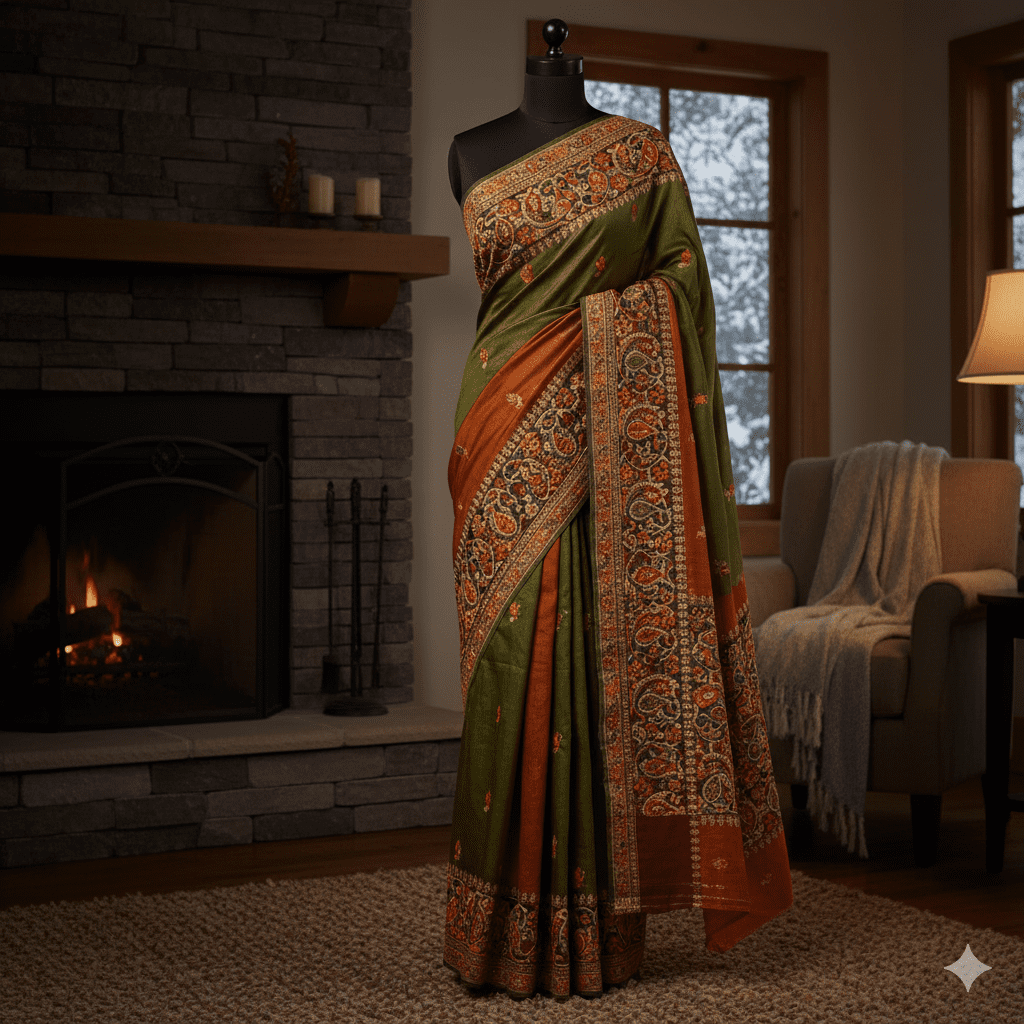 Warm cotton blend saree designed for winter comfort featuring full border embroidery.